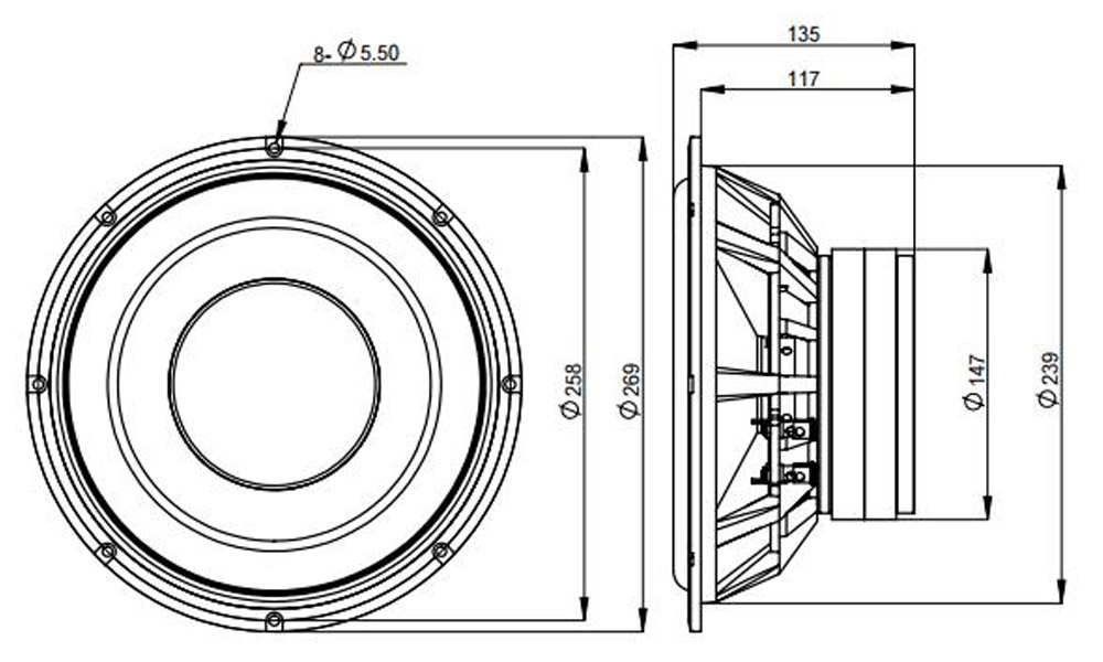 The 101FHW is a high efficiency, (87dB 1watt / 1 meter) 10-inch woofer speaker with extended low frequency response and high power handling capability. The 101FHW uses a strong glass fiber reinforced paper cone assembly along with a single roll rubber surround. Spider is Nomex material with stitched-in tinsel wires. This ensures long lasting performance even in high powered applications. The chosen material combination provides remarkable strength, high efficiency and sustained output under extreme conditions.The 101FHW cone and dust cap are made using glass fiber loaded paper pulp. All “soft” parts are bonded together using state of the art high temperature adhesives. Metal parts in the speaker assembly are coated for extreme weatherization protection. Speaker push terminals are gold plated to ensure the best connection.