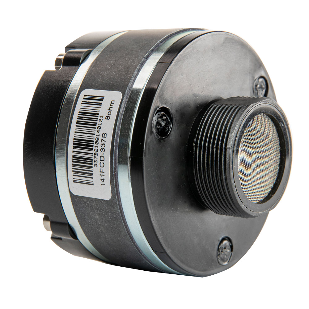 The 141FCD compression driver is a high performance high frequency device ideal for professional loudspeaker systems. It’s core is designed based on our very 140FCD model. In fact the dome assembly is shared between these two models. The driver’s ferrite based magnetic circuit was modified to fit applications with a limited space and lower budget.Furthermore, we have added mounting adapter with 1 3/8” 18TPI thread to easy and fast mounting onto the horn throats that incorporate this thread. Diaphragm AssemblyThe driver features a 36mm Polyimide diaphragm formed as single piece with Polyimide suspension. The suspension has designed and FEM optimized venting features to lover the harmonic distortion. The dome is carefully attached to a high temperature Nomex voice coil former that withstands the long term power characteristics typically seen in professional applications. The acoustic output exits through a radial phase plug and a 1.0 inch throat aperture. Nominal sensitivity is 105 dB 1watt / 1 meter.