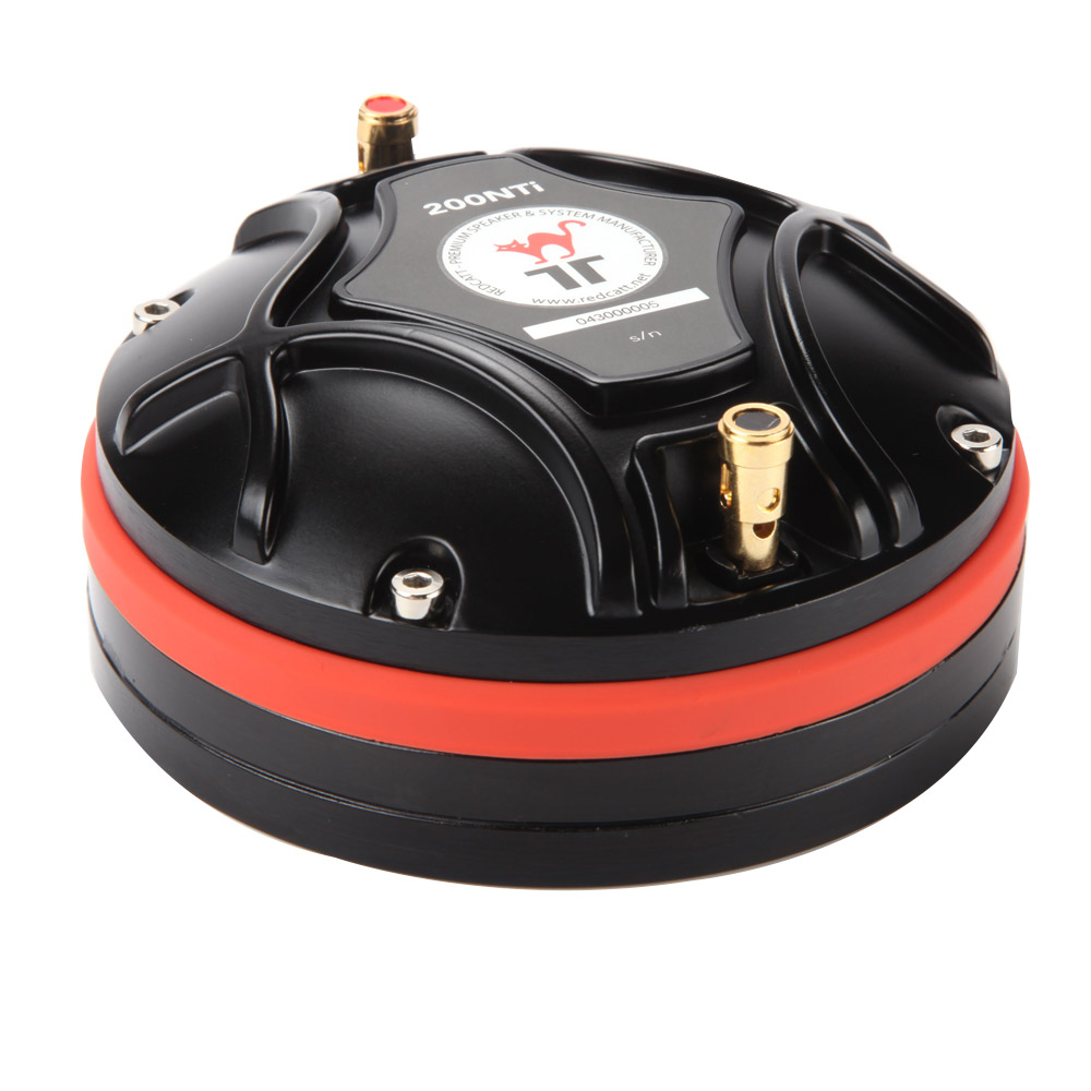 The 200NTi compression driver is a high performance high frequency device ideal for professional loudspeaker systems. The driver’s advanced neodymium based magnetic circuit provides a compact, yet robust, ultra high force BL field with precision control of the pure titanium diaphragm assembly. The unit delivers incredibly linear frequency response and very high power handling through 1.4inch exit throat.The driver features a 75mm pure titanium diaphragm formed as single piece with titanium suspension consisting resonance control features. REDCATT uses advanced manufacturing and quality control techniques, resulting in superb consistency of all our compression drivers. Optimized, lightweight neodymium based magnetic circuit capable of delivering the highest level of performance. Device that offers uncompromising performance featuring high efficiency, exceptional transient response and controlled distortion characteristics. The annular phase plug is CNC machined from a single block of aircraft grade aluminum. Our phase plug is true high-tech masterpiece. The reached shape and aligning tolerances are beyond what have been commercially produced
