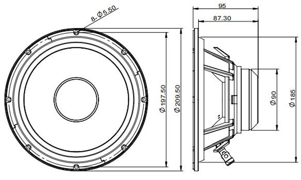 The 8NPM is a high efficiency, (96dB 1watt / 1 meter) 8-inch mid-woofer with extended mid frequency response and high power handling capability. The 8NPM uses a lightweight half pressed paper cone along with a double roll fabric surround. Spider is made of Nomex material with optimized shape for well controlled pistonic motion. The used high quality components ensure long lasting performance even in high powered applications. The chosen material combination provides remarkable strength, high efficiency and sustained output under extreme conditions. Power HandlingThe voice coil featuring Kapton former material capable of withstanding peak temperatures in excess of 280C, well beyond the thermal requirements of modern audio systems. Former strength provides the ideal transfer of power between the voice coil and the cone assembly and assists in reducing distortion artifacts. By combining this material with state of the art adhesives and our winding voice coil technology, the 8NPM delivers incredibly high performance.