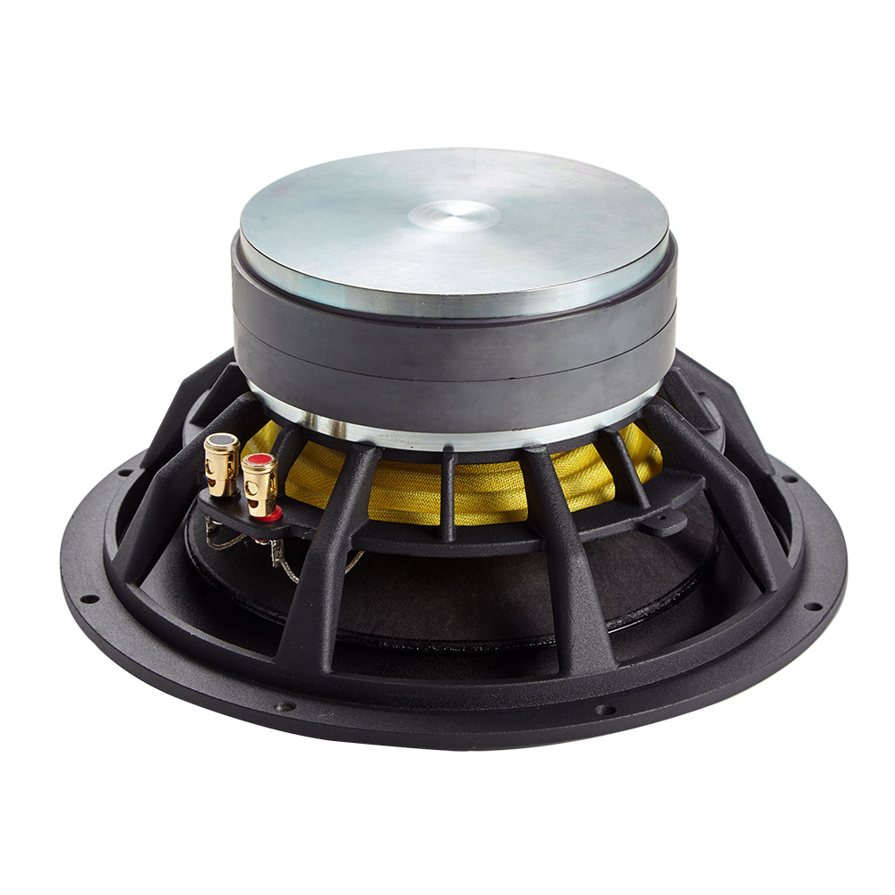 The 101FHW is a high efficiency, (87dB 1watt / 1 meter) 10-inch woofer speaker with extended low frequency response and high power handling capability. The 101FHW uses a strong glass fiber reinforced paper cone assembly along with a single roll rubber surround. Spider is Nomex material with stitched-in tinsel wires. This ensures long lasting performance even in high powered applications. The chosen material combination provides remarkable strength, high efficiency and sustained output under extreme conditions.The 101FHW cone and dust cap are made using glass fiber loaded paper pulp. All “soft” parts are bonded together using state of the art high temperature adhesives. Metal parts in the speaker assembly are coated for extreme weatherization protection. Speaker push terminals are gold plated to ensure the best connection.