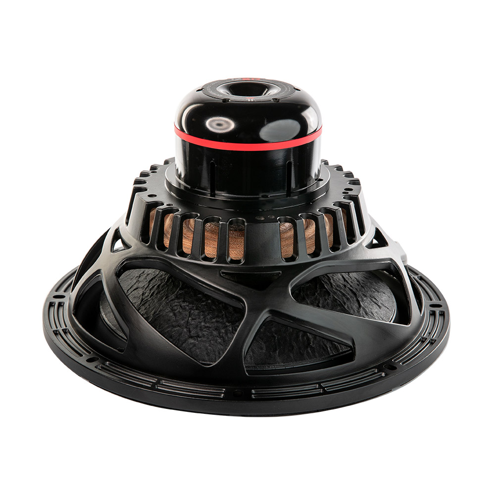 The 12XR was designed around our new approach to the magnetic system. Our XR series speaker motors were designed so the voice coil winding doesn’t leave the gap for most of the cone excursion. The desired cone excursion is carefully evaluated and incorporated into the design. The 12XR allows the designer to design sub-woofers with very large cone excursions, without the otherwise present harmonic distortion due to the voice coil leaving the magnetic gap. If you like the sound of a clean, undistorted bass, then the 12XR is the right transducer for your application. Motor DesignThe magnetic design incorporates large neodymium magnets placed along the voice coil winding. This has allowed us to push the cone excursion to 28mm peak to peak. Unique gap venting ensures good air circulation and greatly improves the reliability of this driver. We have also developed a new technique for manufacturing deep copper caps. The design further sports a large spider on top of which is hot-pressed tinsel wires. Cone is carbon fiber reinforced, with a lightweight foamed rubber surround. The suspension was designed for large excursions.