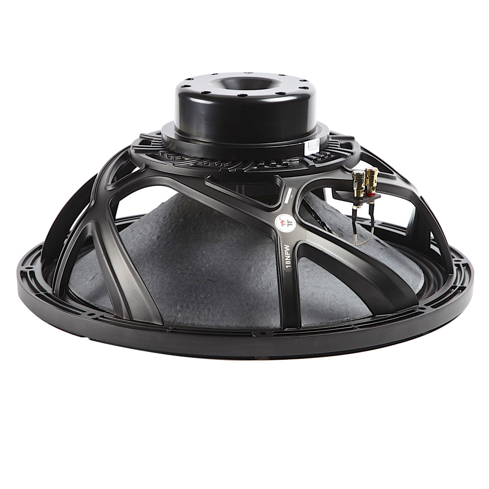The 18NPW is a high efficiency, (99 dB 1watt / 1 meter) 18-inch woofer with incredibly linear frequency response characteristics, extreme high power handling capability while generating low harmonic distortion artifacts. The 18NPW uses a lightweight, but strong, glass fiber loaded cone assembly along with a high excursion triple roll constant geometry surround. This combination provides remarkable strength,high efficiency and a peak to peak maximum excursion of 21.5mm. Power HandlingAt the core of the 18NPW is it’s voice coil technology featuring a composite Polyimide former material capable of withstanding peak temperatures in excess of 350°C, well beyond the thermal requirements of modern professional audio systems. The 18NPW delivers incredible performance. REDCATT has implemented a double layer/silicone spider design to ensure long term Fs memory, consistency and diminish anomalies associated with spider deterioration. The sealed spider works as a air pump and pushes the air trough out motor to increase heat transfer and cooling of the parts.